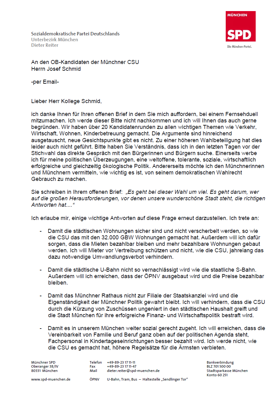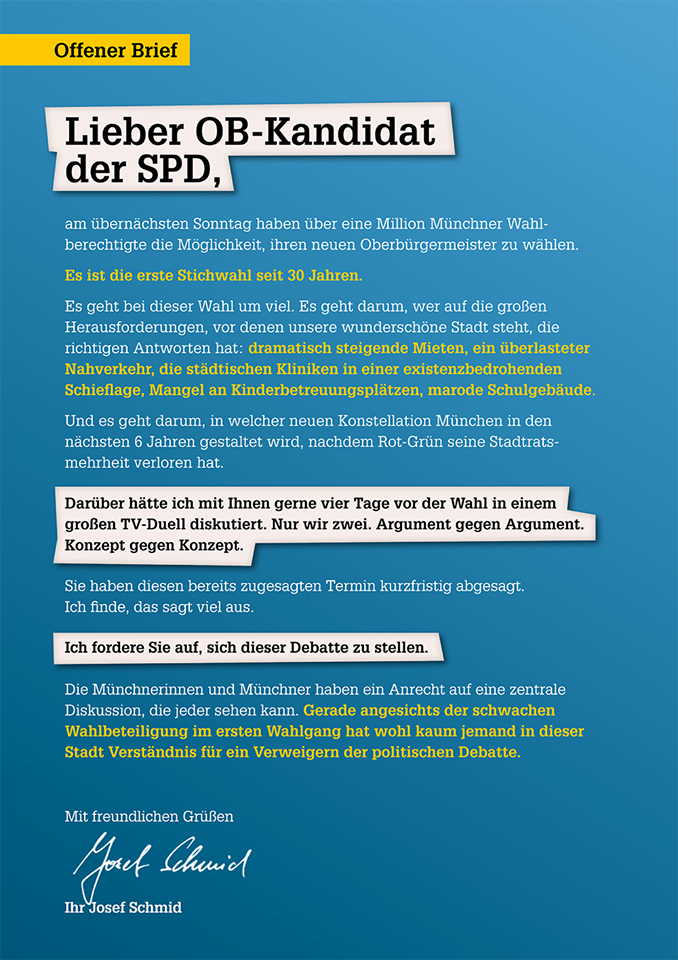 Die Spitzenkandidaten der OB-Stichwahl am 30. März kommunizieren offenbar nur noch per offenem Brief miteinander – das Thema: gibt es vor der Stichwahl noch ein TV-Duellhier bei uns auf münchen.tv oder doch nicht. In diesem offenen Brief fordert Josef Schmid seinen SPD-Konkurrenten Dieter Reiter auf, sich dem Duell zu stellen: